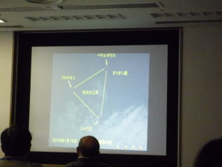 午前は座学。小惑星探査機「はやぶさ2」の話題からはじまり、本論の星座入門。太陽、月、惑星、そして星座のこと、多くのことを学んだ。冬の南東の空に輝く冬の大三角(シリウス、プロキオン、ベテルギウス)のこと、北の方角を教えてくれる星・北極星をカシオペア座から見つける方法も学んだ。