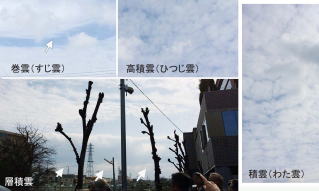 戸外で雲を観察。雲量は80%と見たが、陽射しがあるので天気は晴れ。高い空にすじ雲。その下にひつじ雲とぽっこりした綿雲。下層には西の空に層積雲が現れ、弱い雨となるか