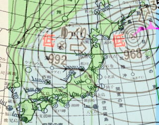 気象庁天気図に、天気、風力・風向を書き込んだ天気図を重ねた。風向は低気圧中心に向かって反時計回り。等圧線の混でいる地域では風が強い。納得!!