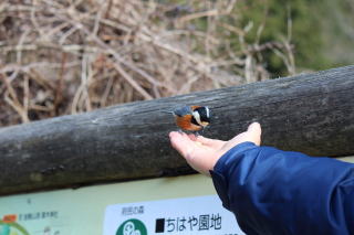 昼食後は園地休憩所前で飛び交うヤマガラへの餌やり。ピーナッツやヒマワリの種を手にしていると人懐っこいヤマガラはすぐに寄ってくる。野鳥と触れ合える楽しいひと時であった。そのあと四季の谷を通って展望台方面へ。途中、地面の草むらの上をぴょこぴょこと動き回る幾羽かのカシラダカ、保護色で見にくかったが何とか観察できた。
