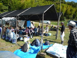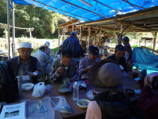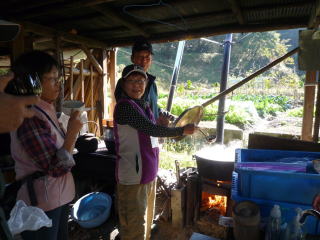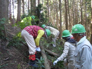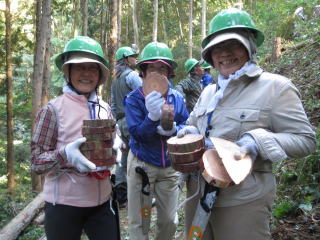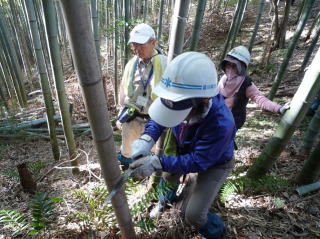 座学のあとは、豚汁づくり。絶妙の味付け?、2杯、3杯と食が進み、見事に完食。午後は竹の間伐体験。鋸をベルトに据え、ヘルメット、皮手袋、スパッツ、すべり止め等、万全の装備で竹林へ。先生の指導のもと、4、5組に分かれてモウソウチクの間伐実体験。タケノコが生えるぐらいに間伐を、という地主さんの要望に基づき、2、3メートルくらいの間が空くように適当な竹を見計らって実施。