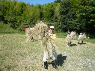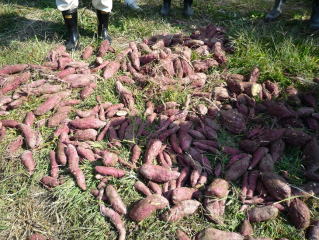 午後は北阪農園へ移動し、芋堀。収穫となると力の入れようが違い、60株はあっという間に終了。お土産に戴いたこの鳴門金時や紅アズマ、1週間ほど干せば一段と甘みがますとか。楽しみだ。最後は金ゴマの脱穀。乾燥させた金ゴマの枝から金ゴマを取り出す作業。これが中々大変な作業。やってもやっても終わらない。金ゴマの枝を振ったり、叩いたり、終いには三々七拍子の音頭を取りながら、ようやく脱穀作業終了し、本日のすべてのメニューを終えた。