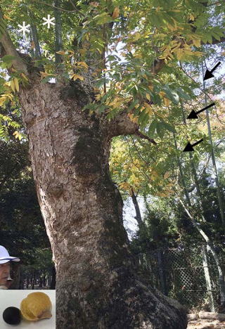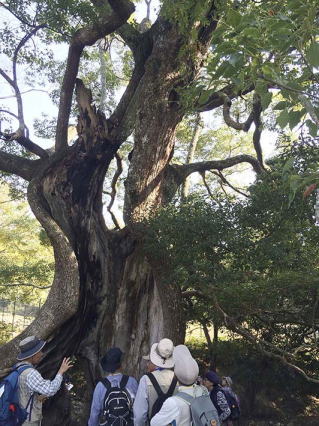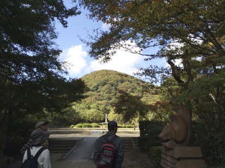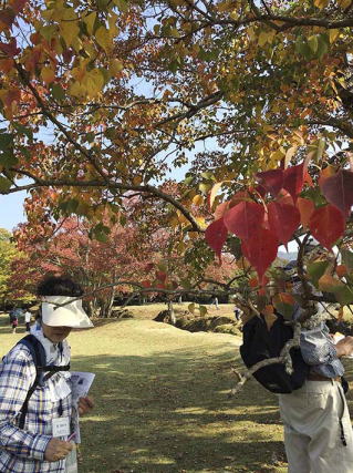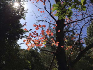 公園に入るとまずは、いいぎり(飯桐)の黄葉がまぶしい。赤い実とのコントラストが引き立つ。今日はハナノキに会いに行きましょう。と先生の言葉。ハナノキとは???花が一杯に咲いている木なのだろうか?甲山を正面に見ながら向かう。お椀のように丸みを帯びた優しいかたち。緑の間に紅葉が交じり澄んだ青空に映えて美しい。緑の常緑樹や、紅葉した落葉広葉樹、木の実の話を伺いながら、公園内を歩き、森林浴を満喫した。