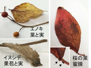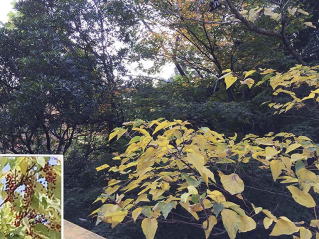 イイギリ(飯桐)の黄葉。左下:イイギリの実
