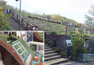 仁川百合野地区。この斜面で地滑りがおこった。今は地滑り防止枠が設置され、春には芝桜が咲き乱れる。左下:地滑り防止枠の模型。長い杭が枠を固い地盤に固定している。