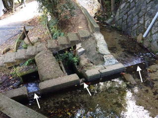 上ヶ原用水分水樋。仁川の取水を巡る争いを解決するため、3方向への分水樋を設置。切り込みの長さで分配率を決めた。1650年頃に作成。現在でも機能し続ける。