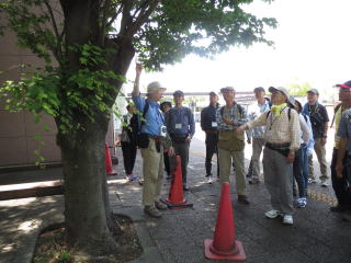午後はファインプラザから植物を観察しながら散策。まず、庭のケヤキについて、シュート(主軸)には大きな葉がつき、小枝には小さい葉、種のつく枝の葉は独特で、葉を羽根の代わりに種のついた小枝ごと飛ばす等、多くの説明を受けた。樹木だけでなく、道端や草地の草花もじっくり観察。緑地の森ではキビタキの美しいさえずりも。