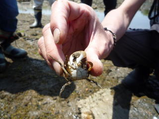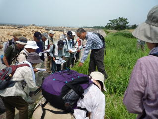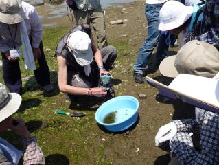 午前は展望塔内で野鳥園の概要説明を受けた後、熱中症対策も万全に干潟へ出て生き物の観察。干潟は水質を浄化してくれ、様々な生物が生まれ育つのに重要な場所。この干潟には沢山の生き物が生息、1平方メートル中にざっと5万の生き物はいるとか。土を掘ったり、石を動かせば必ず生き物がいる。でも観察した後は動かしたものは元に戻してやるのは当然の思いやり。