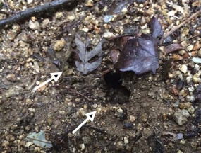 一つでも哺乳類のフィールドサインを見つけようと。この孔、動物の通路違う?? !