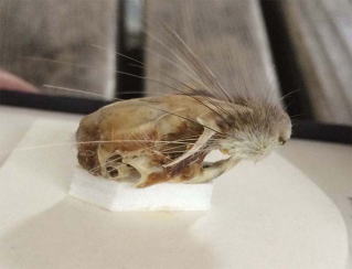 見事なアカネズミ頭部の毛。ぴんと伸ばし、毛に触れることによって孔の大きさを測る