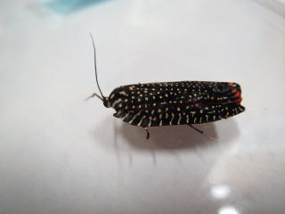 黒地に黄色の斑点が美しいビロードハマキ(蛾)