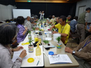 次に井上先生の指導でカラーサンドつくり体験。思いのままに模様作りに挑戦、各人各様の「カラーサンドのテーブルヤシ」を作り上げた。結構、楽しい実習であった。