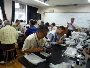 午後はあいにくの雨となったが、泉北高校に移動して実地学習。先ずは何十年ぶりになるのか顕微鏡を使ってプランクトンの観察、皆懐かしく真剣に見入った。