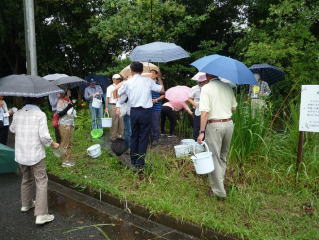 そのあと、フィールド学習へ。自然に近い状態に維持されたビオトープ池では、ヒメガマ・ヨシ・オオミクリなどの水草やメダカなどの多くの生物が生育しているのを観察でき、又、童心に返ってメダカ・ザリガニ採取等も楽しんだ。自然の生態系を維持して行くことの重要性を体感できる身近な場であった。