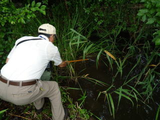 午後は網をもって、いざ実戦。カエル、ヘビを見つけるぞ!前回まむしに出会った時、冷静な対処を見せてくれた和田先生も一緒で心強い。すぐにニホンアカガエルを捕まえた。素手で。さすが生き物大好きの仲間。間をおかず、ニホンカナヘビも。形、模様が実に美しい。滑り出し順調。その後、水を求めて移動し、とのさまがえる、ぬまがえる、オタマジャクシ、ヤゴを捕獲。講座でいただいた資料片手にじっくり特徴を観察した。