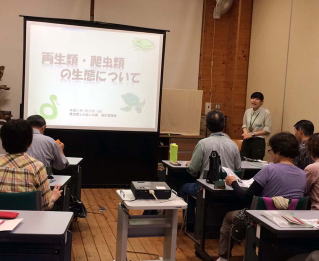 午前中は両生類、爬虫類の生態と題して、木下先生による講義。両生類、爬虫類の構造および生態における両者の相違点について、クイズを交えながら楽しくお話をしていただいた。なるほど、知識を持ってカエルやヘビを見ると、可愛いかも!!