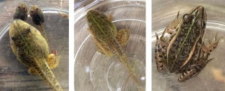 オタマジャクシ→後肢がでて→前肢右→前肢左→とのさまがえる。成長したオタマジャクシから以降には背中に黄色い線がみえる