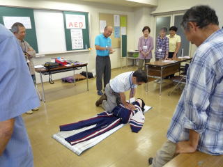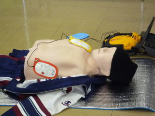 午後は、心臓マッサージ研修用人形・お馴染み「ジミー君」登場、AEDと合わせ、よりリアルに救護の手当の処方を体験。人が目の前で倒れると時間との競争、救命率は1分ごとに10%下がるという。人が倒れて意識がなければ救急車がくるまで(平均8.5分)は、とにかく心臓マッサージ、そしてAED。非常に分かりやすい。