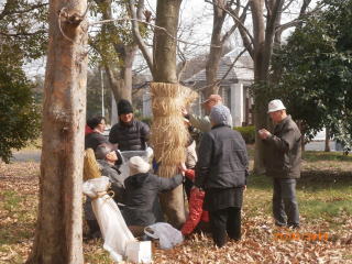 昨年「淡水魚入門」の講座以来の佃先生です。前回の楽しい講座を思い出しつつ今日は、昨年秋に巻いたコモを外したり、また樹皮に隠れている昆虫の冬越しを観察します。