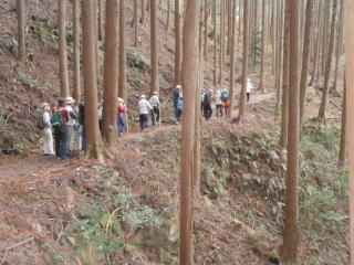 二日目は紀州語り部の小松さん夫妻にガイドしていただきながら、熊野古道中辺路の一部を歩きました。滝尻王子前で熊野古道の歴史や経路を聴き、バス移動後、いよいよ牛馬童子口から近露王子社までの千年の道を歩きます。箸折峠、牛馬童子像など古道にまつわるこぼれ話、シダ類などの草木の話など小松さんのユーモアたっぷりの語りに微笑み、時には歴史の悲劇話に真顔で聞き、最後まで楽しく且つ知的に歩くことができました。山に囲まれたのどかな近露の里でお弁当を食べ、バスで継桜王子へ。“一方杉”と呼ばれる長く太い枝を伸ばした、杉の巨木群が石段を囲むようにそびえ立っていました。沈黙の30秒間、ひんやりとした森の中で見上げると、樹齢800年、参拝者を静かに見つめてきた杉たちの木霊を感じ、空に向かってどこまでも伸ばした幹・枝に吸い込まれそうな思いになります。日本名水百選の1つ“野中の清水”でのどを潤し、「いつかみんなで中辺路を歩きたいなあ。」を締めくくりの言葉として、私たちの熊野古道の旅も終わりとなりました。(活動報告作成2班)