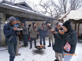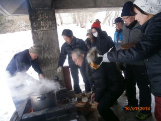 みんなで準備した豚汁の材料を持ち寄って、早速調理開始。“火起こし部隊”の男性諸氏が率先垂範して薪で火を熾し鍋に次々と材料を入れ和気あいあいと料理してくれ、なんと頼もしい。出来上がった豚汁と各自持って来たおにぎり、漬け物等でお昼ご飯。寒い中で食べる豚汁のなんと美味しいこと、一人三杯のノルマ?もこなし食後の珈琲、皆で持ち寄ったおやつ、お汁粉等々焚き火を囲みながらワイワイ。時折降ってくる雪に震えながらも楽しいひと時。後片付けも男性中心にみんなで手際よくススで真っ黒の鍋もピカピカ、火消し隊長の見事な鎮火で無事終了。