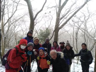 あっという間に時間が過ぎ、雪も降り出して下山の準備。ロープウェイ組は山全体を見渡しながら先に下山したが、残念ながら景色は雪が思いの外少なかった様子。登山組は行きと違うコースで文殊尾根を下山。冷たい風を肌で感じ、雪道をキュッキュッと踏みしめ、粉雪から霰そして牡丹雪と変わっていく様を楽しみ、下山途中の木の枝先に付いた氷の粒々。霧氷だ!いつも見られるわけではない、グッドタイミング思わず皆で記念写真。そして足の長さを痛感する高低差のある階段、凍った長い下り坂をへっぴり腰で肝を冷やしながら降りようやく出発地点に全員無事到着!バスを待つ間降りしきる雪で白くなった木々や道路。なんと美しい。辛い所もあった冬山登山。でもそれにも勝る魅力的な冬の金剛山万歳!!(活動報告作成1班)