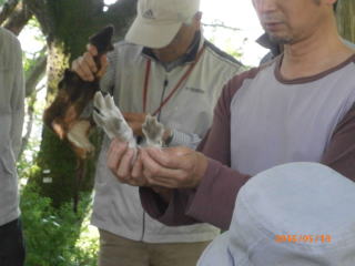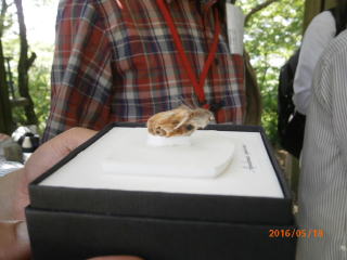 公園の東屋に戻り、早川コレクションの展示会を開始。コウモリやノネズミの骨格標本から始まり、5年物のモグラの焼酎漬け登場で一気にテンションが上がる。イノシシとシカの脚の違いが生態の違いと結びついていること、ウサギの脚を見せながらウサギ狩りでは何故、上に追い上げるのかなどの説明。ビロードのようなモグラの毛皮を思わず頬に当ててみる人も。リュックから次々に出て来る標本に皆、夢中になりました。最後はシカとイノシシの頭骨で締めてコレクションの展示会も終わりました。