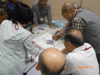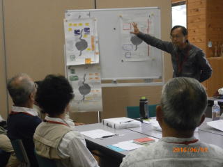 講義後は3班に分かれて、ミニタウン開発のシミュレーション。川で分断された土地を住民・農場経営者・企業経営者等に役割分担し、互いに協議し、どこにどんな施設を配置するにかを決め、発表した。先生によると、正解案というものはなく、話し合って決めることの大事さを学んでもらうのが目的とのことであった。