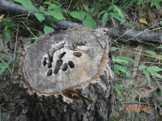 シロスジカミキリの幼虫が暮らしていたクヌギの木造アパート。部屋は意外に広い。