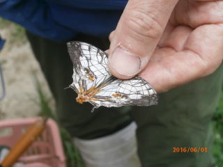畑地で見つけたイシガケチョウ。別名、地球蝶(経線と緯線がわかりますか)。