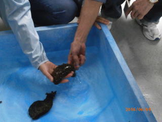 水産技術センターでナマコ触り放題。他にヒトデやアメフラシも。