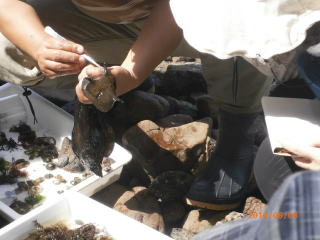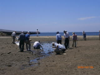 午後からは、近くの豊国崎の磯で生き物を採取。貝塚自然遊学館の山田先生に来て頂き、採取したそれぞれの生き物について詳しく説明をしてもらった。ちょっと見にはフナムシとカメノテ以外は見当たらないようであったが、懸命に探して40種類近く採取できた。