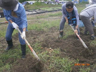 初めにゴールドファームのアシスタントより、4種類の鍬の特徴と各々の使い方の違いを教えてもらった後、ジャガイモ掘りを開始したが、レクチャーは全く無駄であった。それでも、収穫はうれしい量であった。昼食の終わり頃に雨が降り始めたので、屋根のあるこうのやま農村公園に移動した。ゴールドファーム設立の経緯から現在の取り組みについて説明して頂いた後、金ゴマの種播き。金ゴマがゴールドファームの目玉の一つであると聞かされた直後なので、責任を感じる。ファーム側の作戦勝ちか。