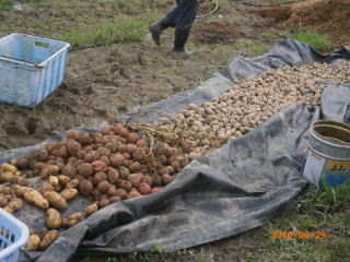 待望のジャガイモ掘り。ザックリが出ると周囲からブーイングと厳しい目線が。