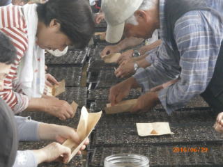 トレーへの金ゴマの種播き。種が小さく軽いので、良く見ないと指先に貼りついたまま。