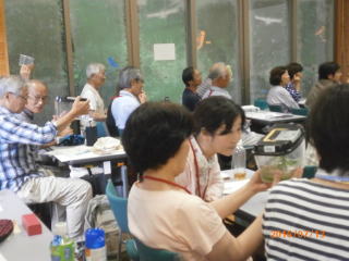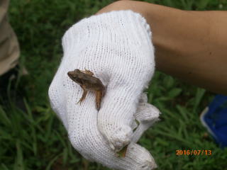 空模様がはっきりとしない中、午前は両生類、は虫類と昆虫の採集で各自大小の捕獲網を片手にさっそうとフィールドへ。その時、タイミングよく鳥のさえずり。誰かがコジュケイですね。鳴き声は「ちょっと来い、ちょっと来い」幸先良し。ヌマガエル、ザリガニ、エビ、各種バッタ、セミは受講生で何とか、は虫類はすばしっこくてニホントカゲは逃がす有様。