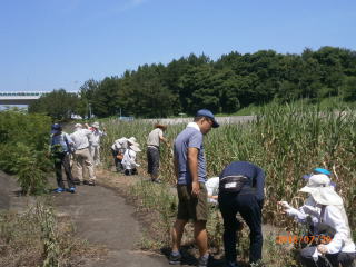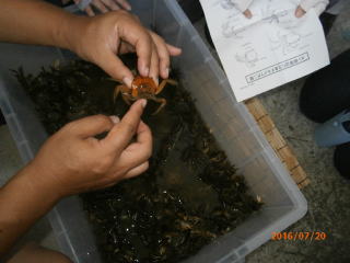 午前はスタッフが用意した竿と餌の竹輪でヨシ(ダンチク)が茂る場所でのカニ釣り、成果は上々。約200匹のカニを釣り上げ(一人当たり7匹を釣り上げた勘定)、先生がカニを手に取りアシハラガ二、クロベンケイガ二、ベンケイガニ、ハマガ二と各々の特長を説明、こんなにまじまじとカニを見入ったことは無い、皆さん、にわかカニ博士の気分。