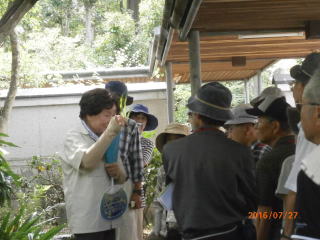 午後から、都市緑化センターの四季の庭、蓮池、里山の庭、温室とコースを巡り、先生が植物名とそれにまつわる話を入れての熱い説明。八重ヤマブキ、大賀ハス、マサキ、カリン、シャガ、一両から万両までの木等々、特にシャガの葉は単面葉で葉の裏面が表となっている話には受講生もビックリ。アヤメ、ネギがこの類。