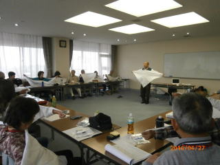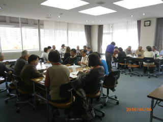 午後からの自己紹介では受講の動機や仕事、趣味などについて2、3分ずつ話して頂いた。とくに受講の動機では、家庭の事情がチラリと見えたりして爆笑の連続でした。皆さんスピーチが上手です。引き続いて行われた班別の打ち合わせでは、活発に会話が交わされ、和やかなムードでした。来週から始まる2年間の講座を楽しみにして、思い出に残る開講式を終了した。