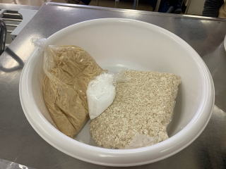- 味噌造りの材料は米こうじ・大豆・塩で、この配合比率や仕込み時期により白味噌と赤味噌ができる。今回は白味噌造り。