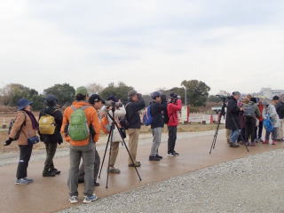 遊歩道沿いに河口付近に移動すると、カワウ、アオサギ、先生のスコープには愛らしいイソシギの姿、砂浜にはたくさんのオカヨシガモがくつろいでいる。その中に数羽の種類の違うカモがいると言われるがどれも同じように見えて区別できない。空にはカモメ、トビ、英名「オスプレイ」のミサゴは優雅に飛んでいるが、魚をみつけると急降下して水中に飛び込み捕まえるとの事。期待しながら待っていたが残念ながら本日は飛んでいる姿を見るのみ。遊歩道沿いの山側にはスズメ、ヒヨドリ、イソヒヨドリ、ムクドリ、ジョウビタキなどが見られた。