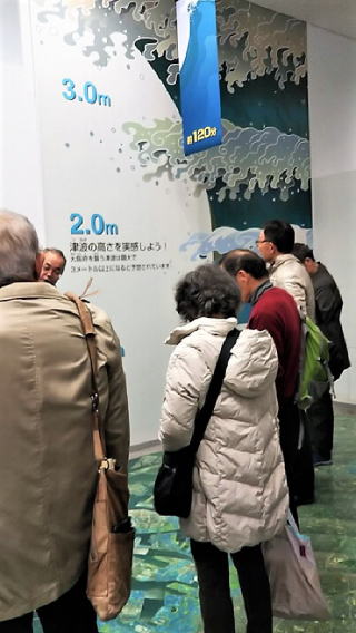 午後から津波高潮ステーションへ。大阪は地盤沈下などで海面より低いところが多く、過去台風などにより大きな高潮被害を受けた。その経験により防潮堤、水門が設置されている。高潮は低気圧で吸い上げられた海水が風でふきよせられる、波長は数m~数百m。津波は地震などで海底の地形が変化するとそのまま海面に現れるので波長は数km~数百kmになる。津波災害体感シアターの迫力ある画面で津波の恐ろしさを体感する。