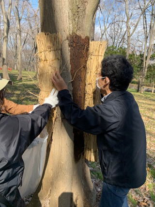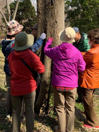樹皮の内側に潜む昆虫たちを探す。変な人たちが木に話しかけているのではありませんよ。
