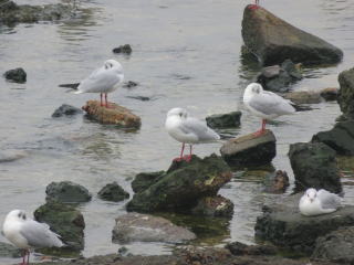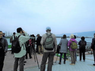 どんよりとした曇り空、甲子園浜で海辺の野鳥観察。ここは砂浜のある阪神間で数少ない海岸線、冬には多くのカモ類、海鳥が集まる所で、今の時期冬鳥は北に旅立ちつつあるとの事。観察に入る前にカモ類、カモメ類を見分ける為の特徴の説明を受ける。海側を眺めるとユリカモメがずらりと岩に並び羽を休めている。波間にはヒドリガモ、オカヨシガモ、オオバンなどが浮いている。黒いくちばしのコサギは、餌を見つけると優雅に佇んでいる姿から想像できない素早い動きをして捕らえている。ウミアイサは潜ったり浮かんだり双眼鏡をあわせるのが忙しい。