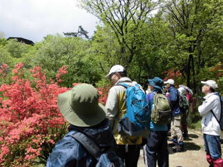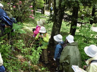 念仏坂を上りきると満開のヤマツツジの歓迎。ちはや園地ではスミレはほとんど咲きおわっていたがシャクナゲ、ヤマブキソウ、ミヤマキケマン、ミヤマハコベ、徳川葵の御紋のフタバアオイ、エンレソウなどの花が見られ、今の時期多く見られるムロウテンナンショウの構造の説明を聞いた。先生が虫の入っているテンナンショウを見つけられ仏炎苞のふたを開け順番に観察をした。