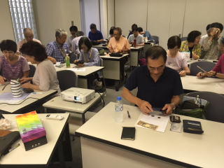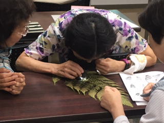 大阪南部地域でシダ植物の観察を続ける辻井先生から、まずはシダ植物の各部位の名称や生育時期、根茎・鱗片・葉身・包膜の色と形等を教わる。先生の説明に出てくる「羽片、2回羽状、中肋」等の用語に戸惑いつつも、質問するうちにおぼろげながら理解が進む。さらに先生が前日採集された数種類のシダをルーペで観察し始めると、皆さん熱心に見入っていた。
