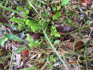 午後はやや雨が治まったので光明池緑地へ、次から次へとシダの名前が紹介される。道なき道を一列になって進む場面では、伝言ゲームで伝えて行く。最後に室内でおさらいして終了、普段は見過ごしがちのシダ植物だが、特徴のあるベニシダ・ワラビ・イノモトソウ・ウラジロあたりは憶えられたかな?