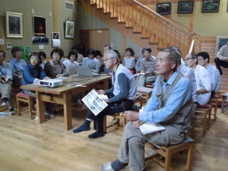 美山かやぶきの里見学へ、雨の為早々に切り上げ宿舎山の家へ向かう。食事前に福本ガイドより芦生研究林の説明を受ける。7日は雨を心配したが素晴らしい青空。