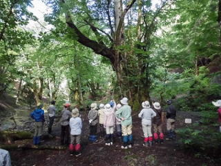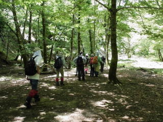 上谷・杉尾峠コースに出発。ヤマザクラなど着床しているカツラの保存木の大きさに圧倒され出発点の長治谷作業所へ。天然杉の生育を促すため広葉樹の巻枯らしを行った長治谷保存林が見える。オオルリ、アカショウビンの鳴き声を聞きながら、いくつかの流れを渡りサワグルミ、トチの木、ブナなどの大木、クマハギされた杉に出会う。伏状更新している芦生杉、葉が下を向いているのは雪の多さに対応するため。モリアオガエルの卵塊も見られた。今の時期はイワガラミ、オオバアサガラ、ツルアジサイ、ヤマボウシなど緑のなかで目立つよう白い花がほとんどで数年ぶりにハクウンボクの花がよく咲いたとの事。ギンリョウソウ、ショウキランも咲いていた。