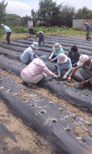 最初は手順の要領が悪くて、植え付けがスムーズに進まなかったが時間の経過とともに分業、協力により植え付けのスピードがアップして午前中で14畝2,800個の苗の植え付けを完了した。予定では4種類の体験作業であったが午後もゴマの苗の植え付けの作業となり、昼食と休憩で体力の回復を図り10畝(1畝:70×2=140)1,400個の苗を植え付けて合計4,200個のゴマの苗を植え付けました。